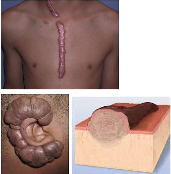 通常是在皮膚緊的地方(前胸,背部,耳,上臂)容易發生,患者會有痛、癢的症狀。形狀常常是不規則隆起紅色的疤痕。
