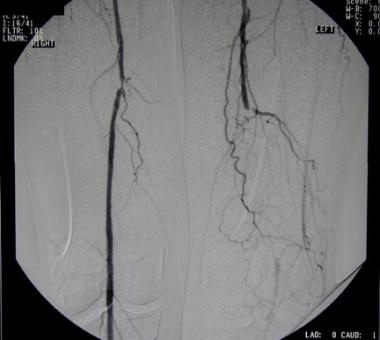 血管攝影:例如下圖為左腳PAOD的病例,可見在血管攝影下左腳血管不像右邊這麼粗,只能依靠側支循環提供下肢血流。