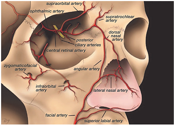 - 臉部血管分布: 要避免打到這些血管才能減少併發症產生。一般非科班出身醫師對於這些解剖構造不夠熟悉,都可能造成嚴重併發症。